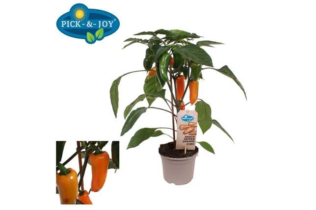 The Pick-&-Joy® Snack Pepper Orange is a delightful sweet pepper plant, yielding a high amount of the famous orange snack pepper. The orange mini peppers are extra sweet, which makes them extra delicious. The sweet peppers from Pick-&-Joy® Snack Pepper Orange come in snack size, and the plant has fine leaves and a full plant structure. That means the plant looks great, whether in the home or the garden. As soon as the ripe fruit is first harvested, the sweet pepper plant will continue to bear fruit if cared for properly. Enjoy for the whole season long!