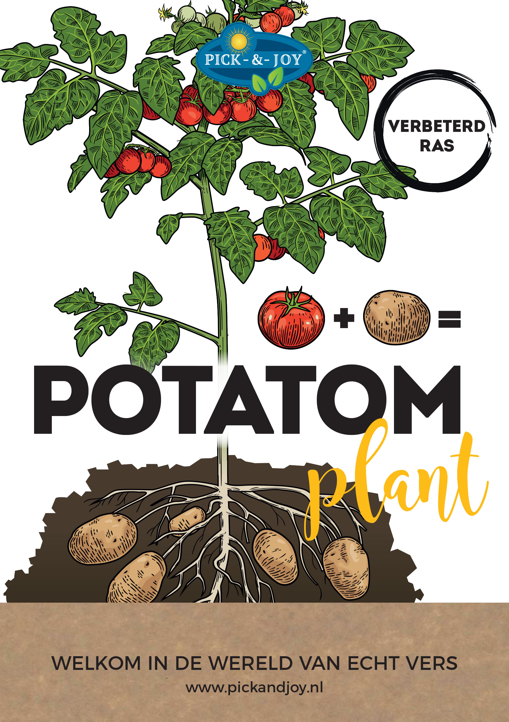 De Potatom blijft een uniek product binnen het Pick-&-Joy® concept van Vreugdenhil Young Plants, wat inmiddels bestaat uit meer dan 16 variëteiten gezonde, smaakvolle plukgroenten. De Potatom, tomaten én aardappelen samen aan één plant blijft verrassend, uniek en voor heel veel consumenten nog steeds volkomen nieuw. Vreugdenhil Young Plants komt met een verbeterde versie aankomend seizoen. Door een verbeterd nieuw ras geeft de Potatom smaakvollere cocktailtomaten naast stevige, vastkokende aardappelen en is de plant iets compacter dan voorheen wat een groot voordeel is in het winkelschap. Naast de verbeteringen aan de plant heeft ook de verpakking een nieuwe uitstraling gekregen. Er is een nieuw etiket ontwikkeld waardoor de consument in één oogopslag begrijpt wat er zo uniek is aan de Potatom.